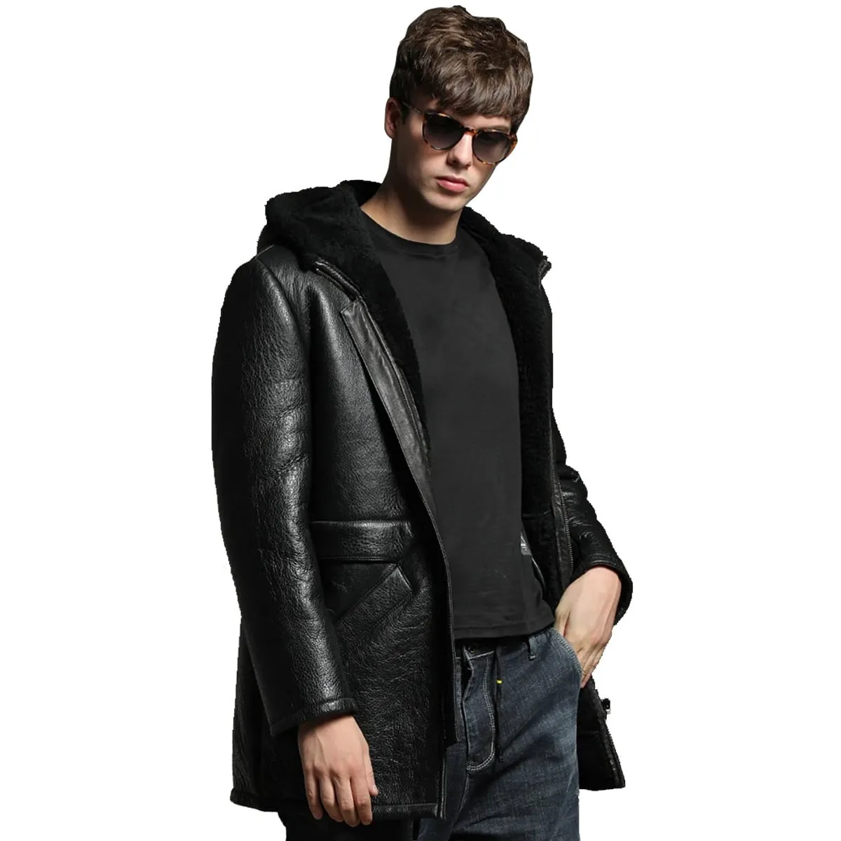 Men’s Black Genuine Sheepskin Faux Fur Hoodie Winter Warm Casual Leather Coat Jacket