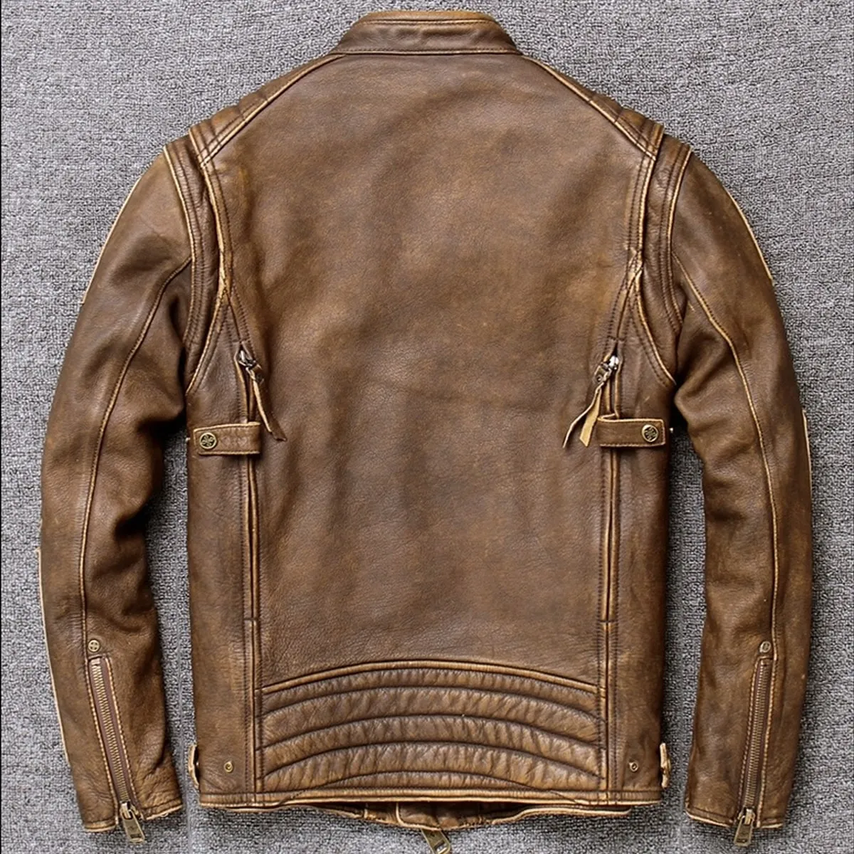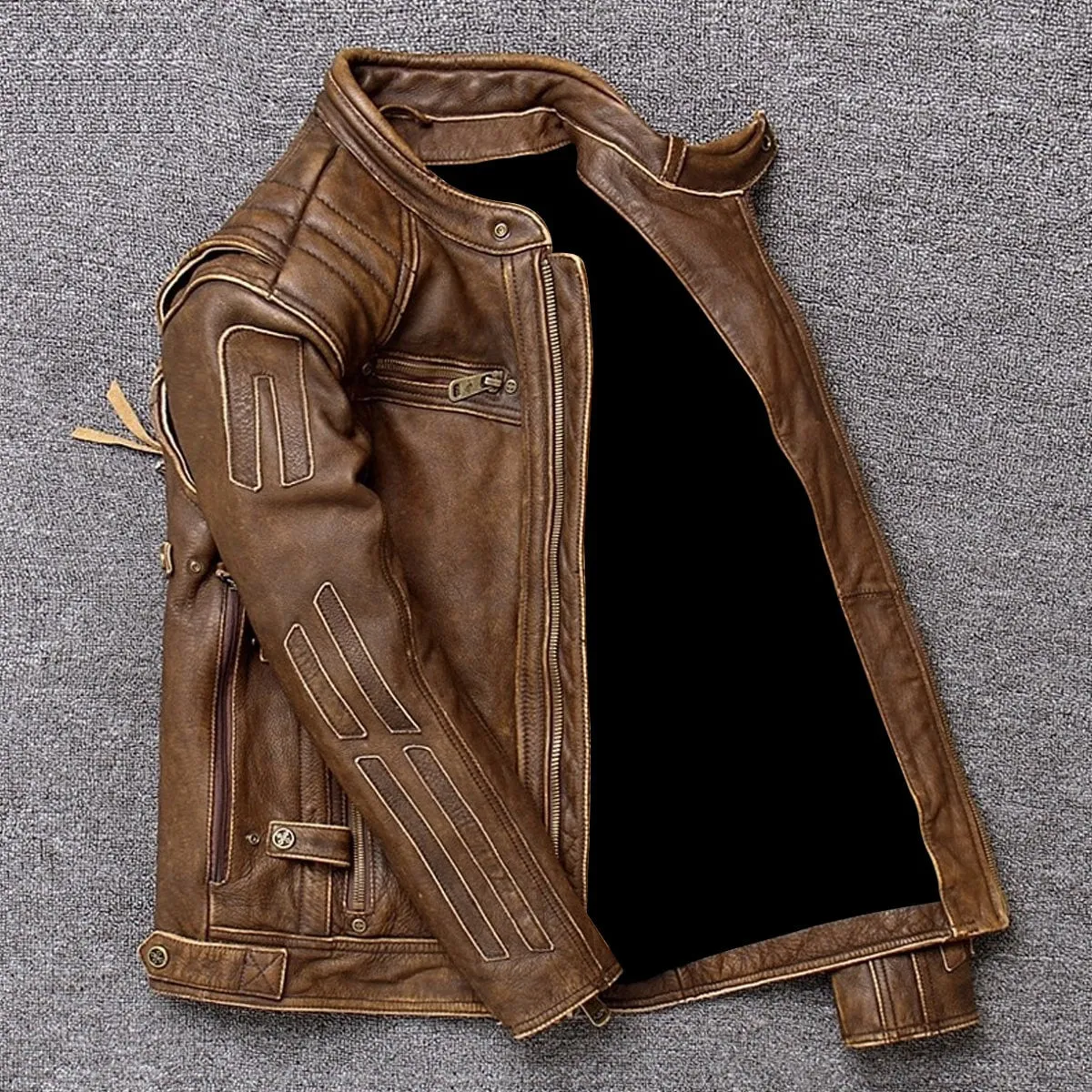 Men’s Vintage Brown Cowhide Genuine Stand Collar Trucker Motorcycle Biker Leather Jacket