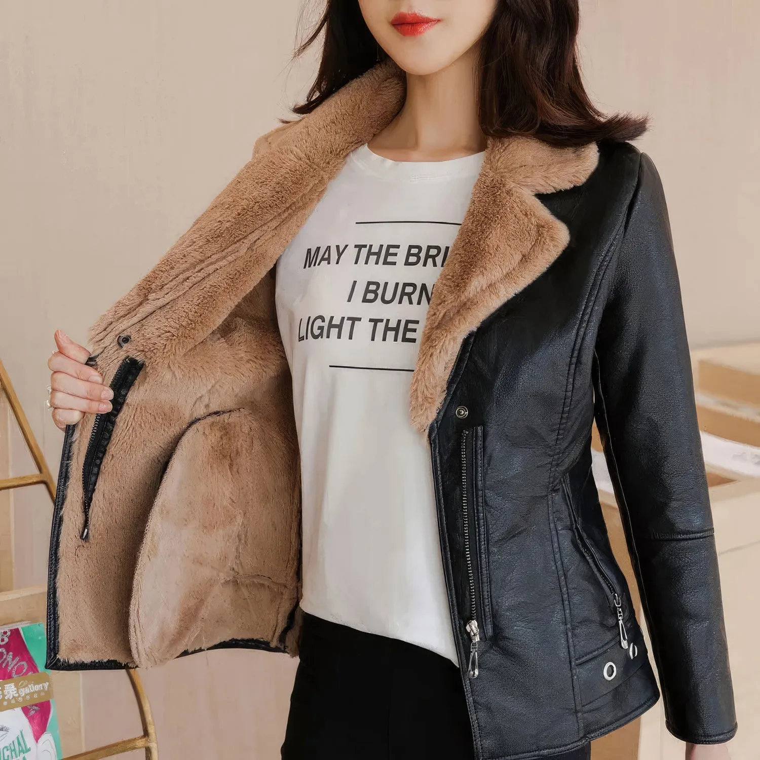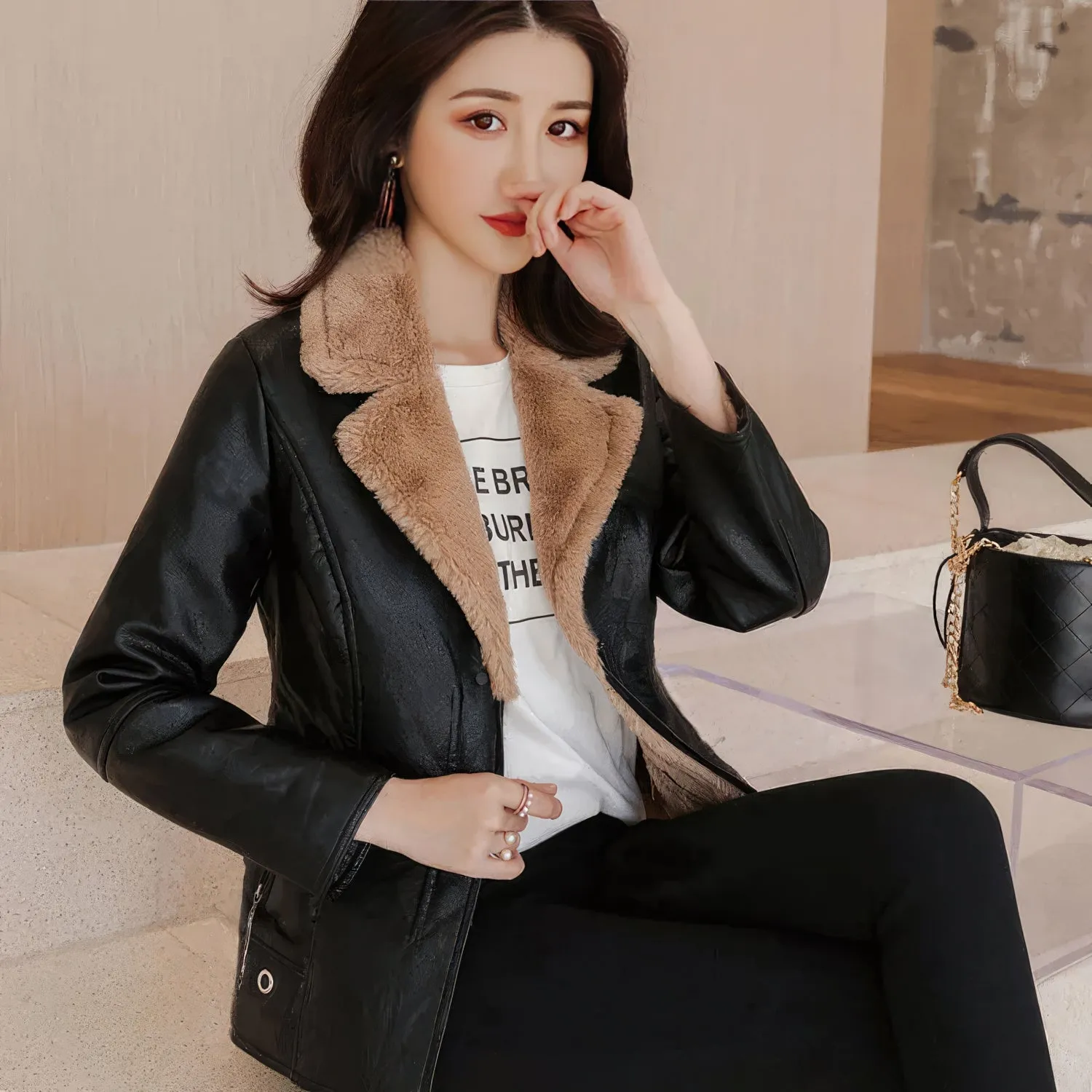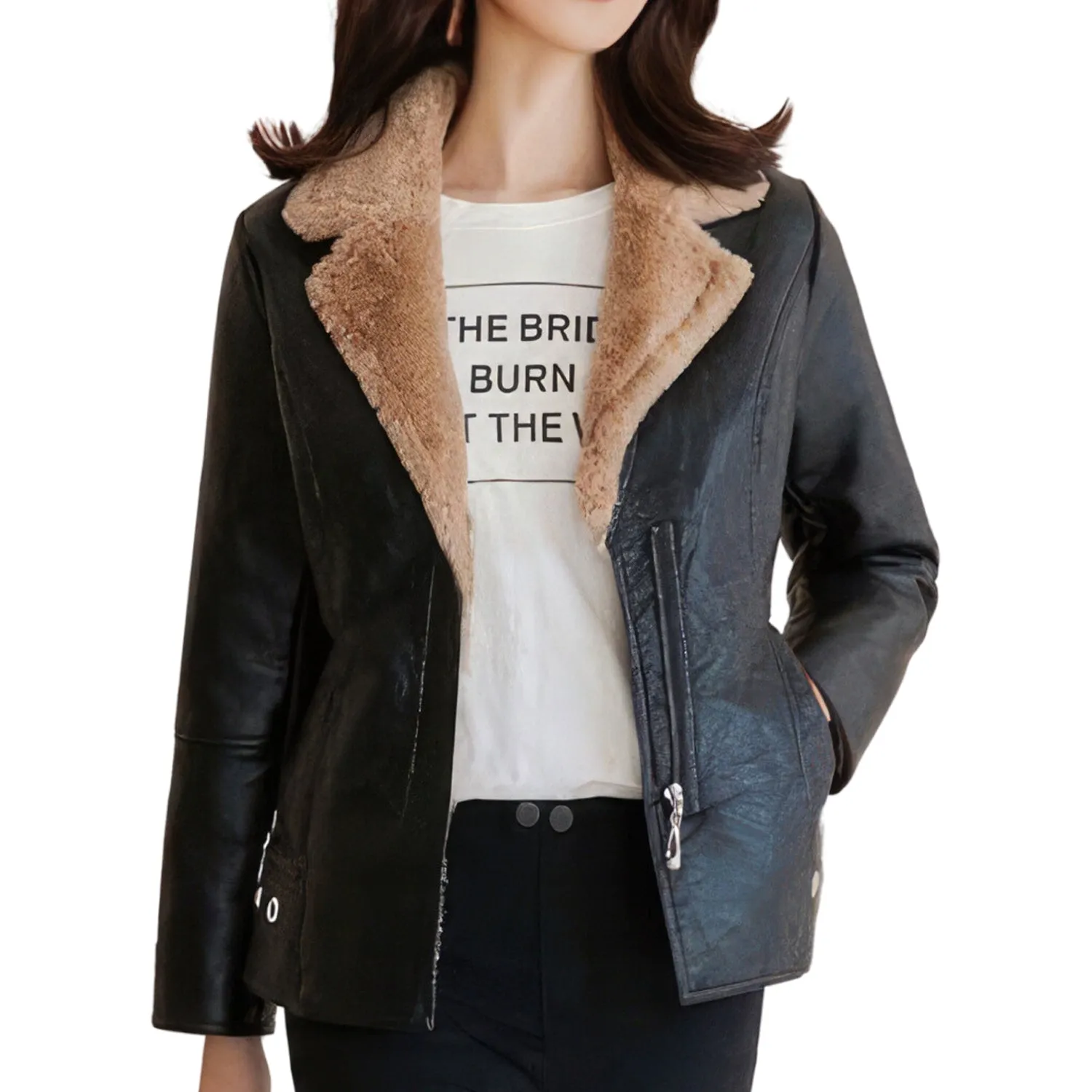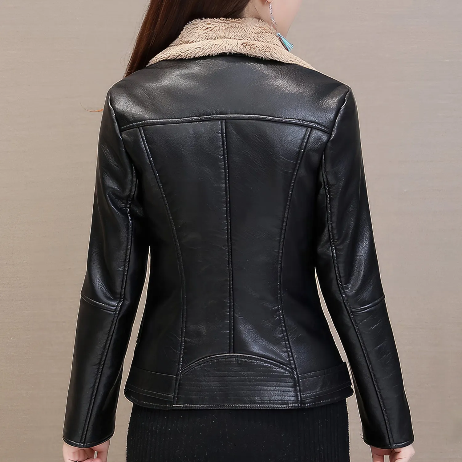 Women’s Black Biker Genuine Sheepskin Sherpa Shearling Faux Fur Lined Café Racer Korean Fashion Motorcycle Slim Fit Leather Jacket