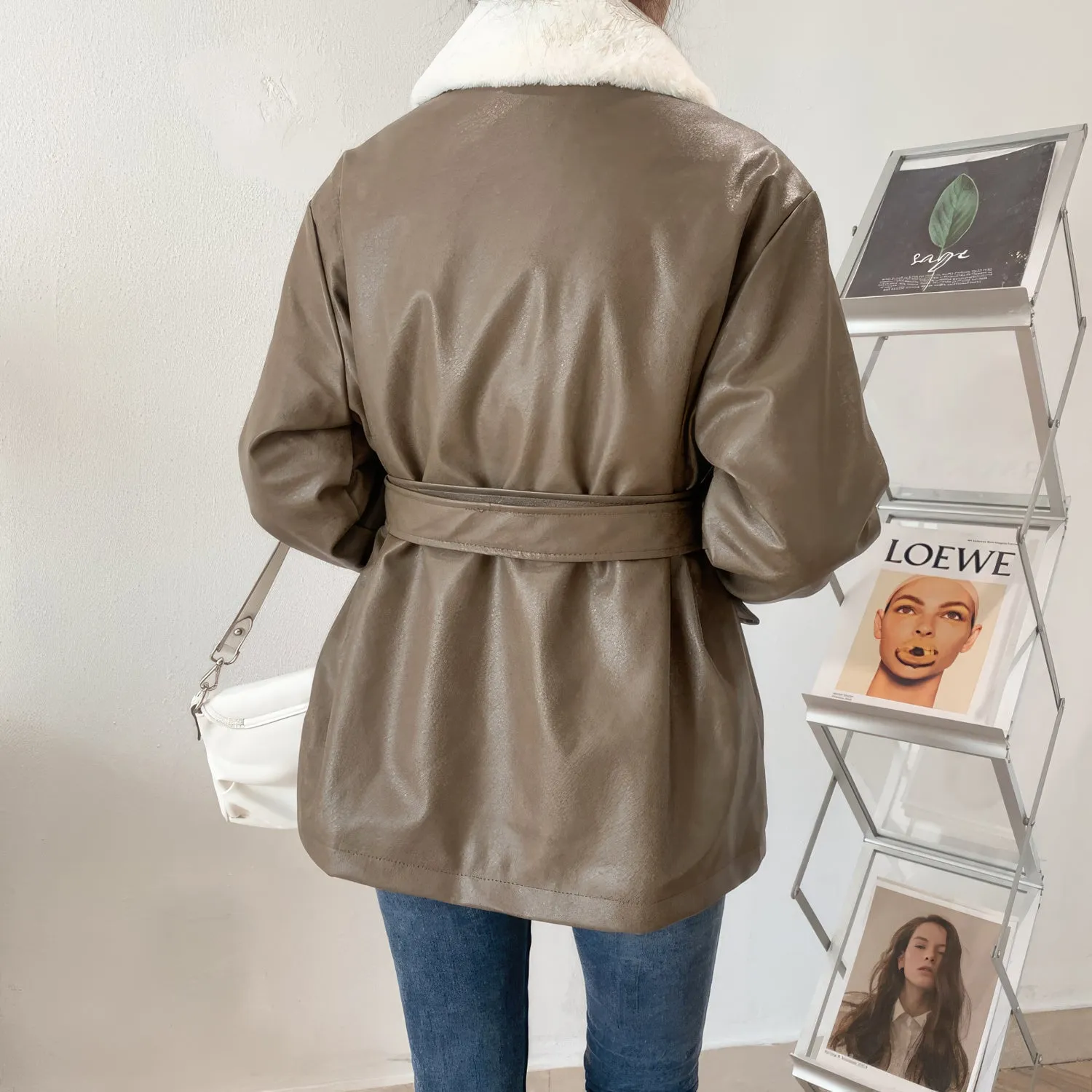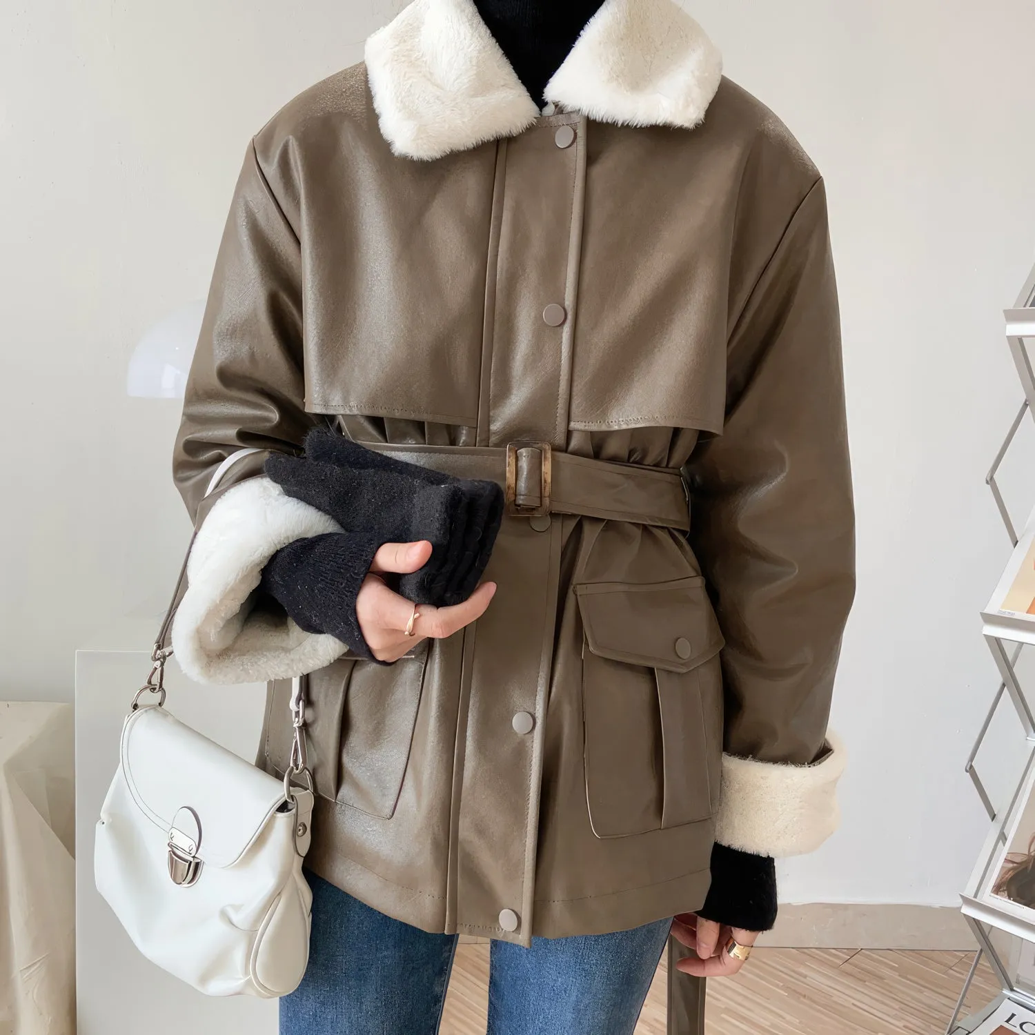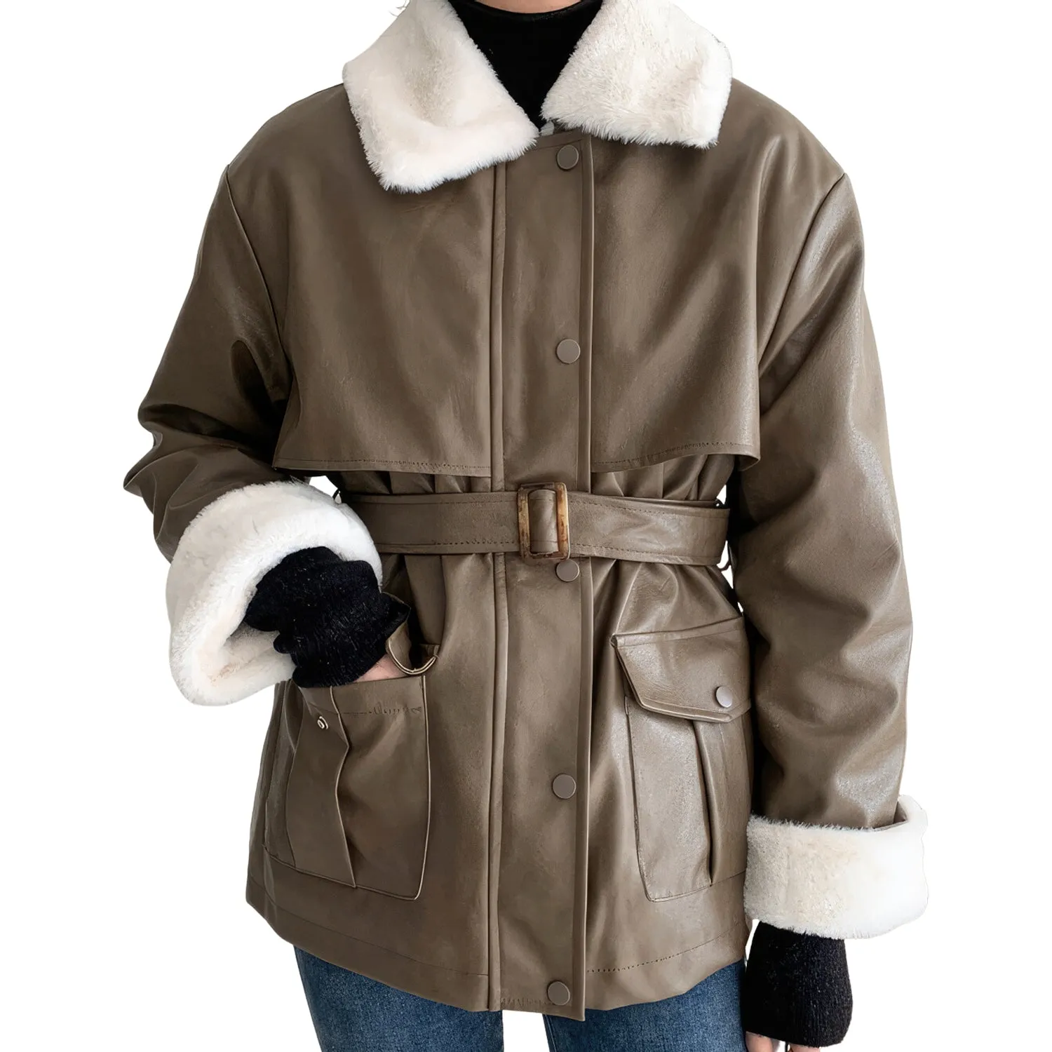 Women’s Brown Genuine Sheepskin Sherpa Shearling Faux Fur Lined Belted Winter Warm Casual Fashion Loose Leather Jacket