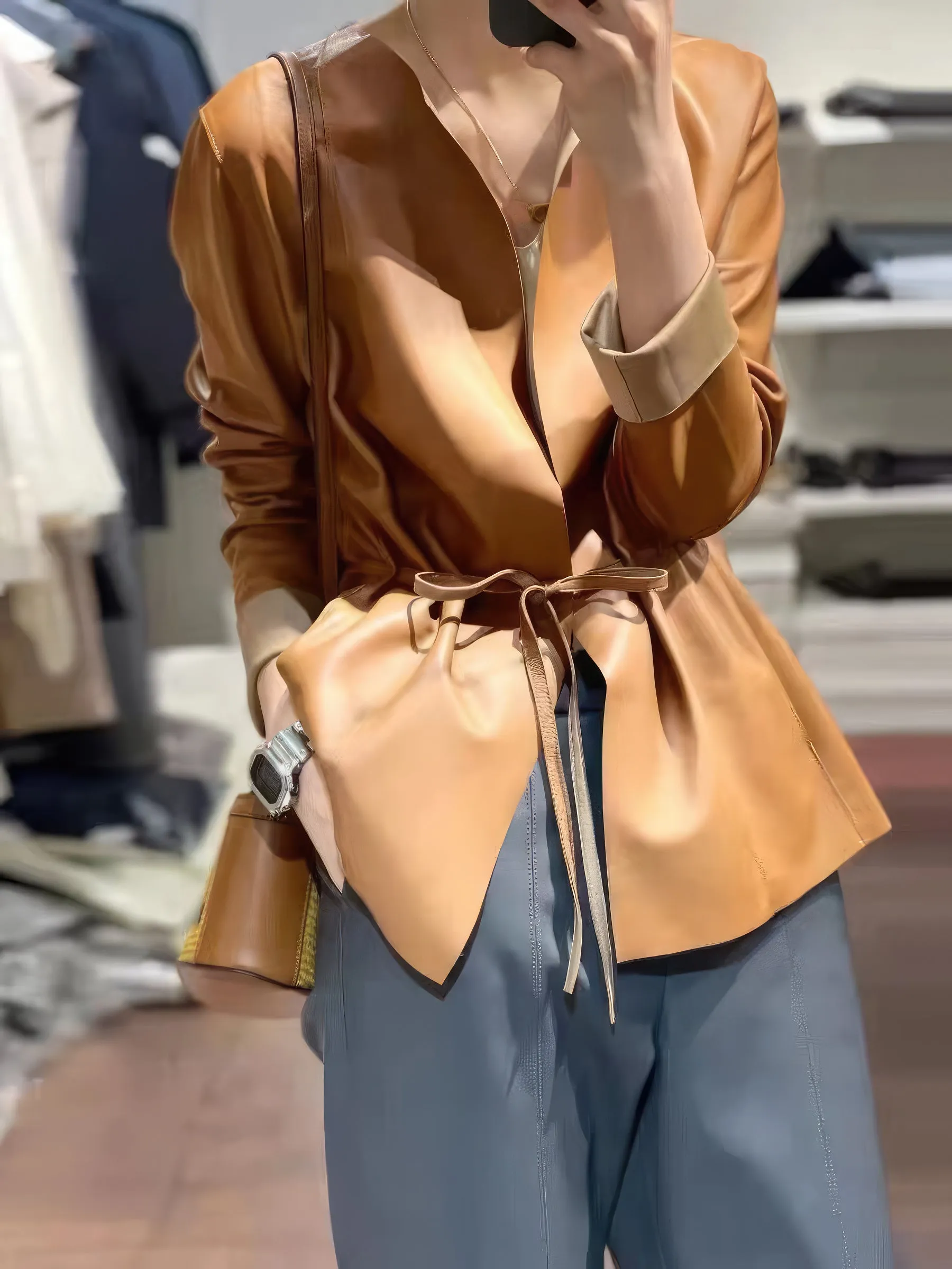 Women’s Sepia Brown Genuine Sheepskin Round Neck Casual European Streetwear Top Fashion Pleated Simple Classic Leather Coat